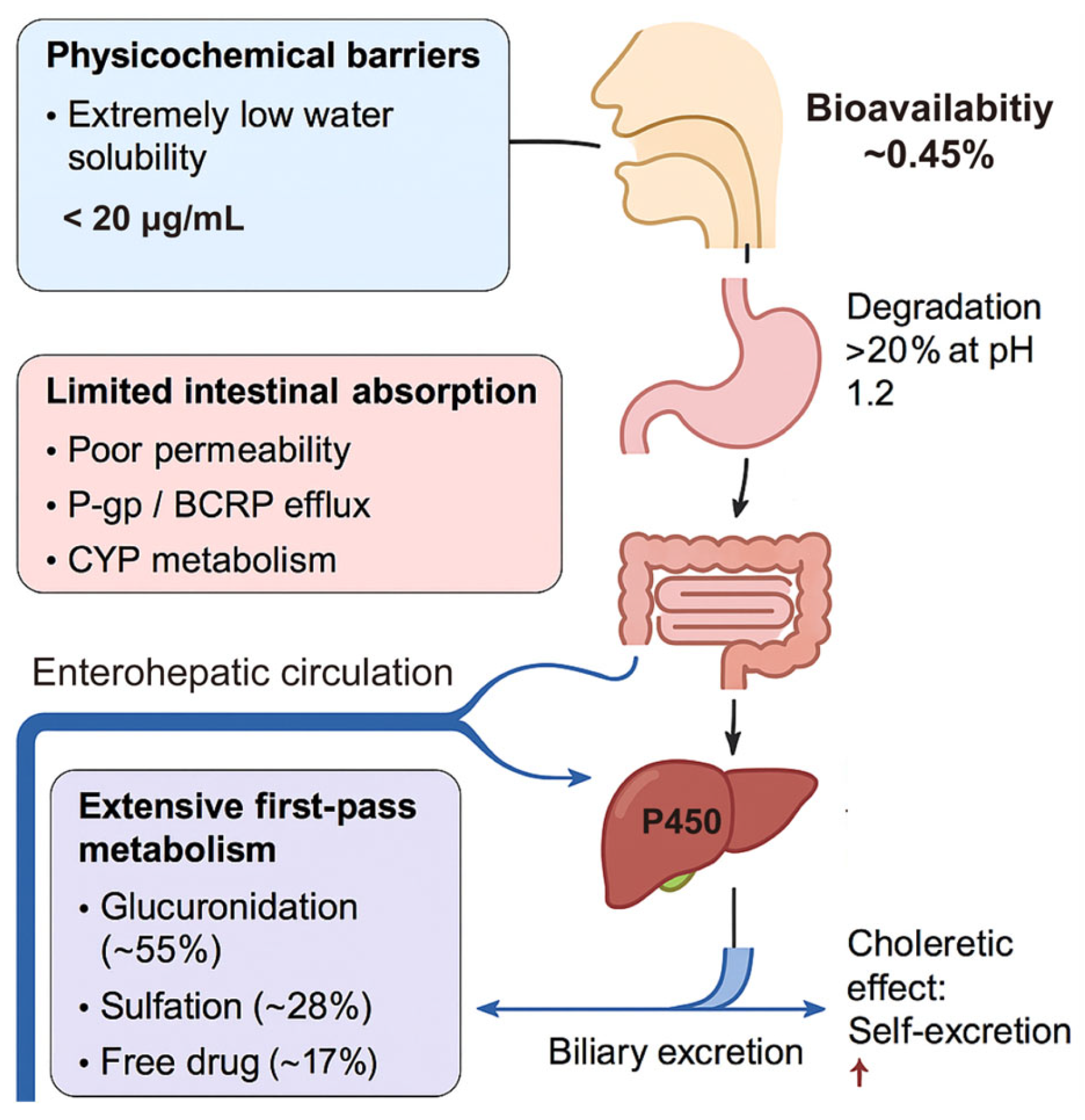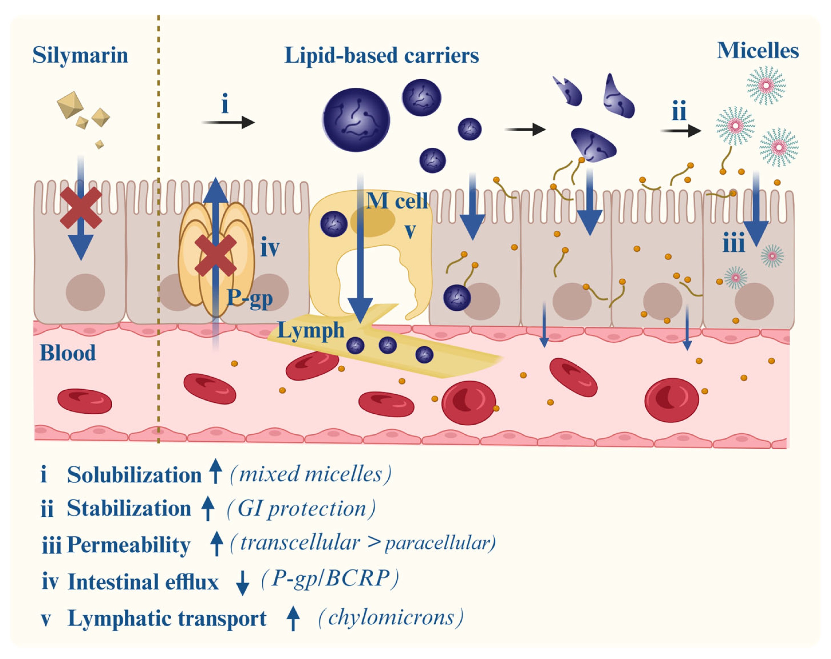 | Silymarin; oleoyl macrogol glycerides | Solubility & absorption ↑ | Dissolution ↑ 13×; bioavailability ↑ 7.6× | Lymphatic transport unpredictable | [74] | |