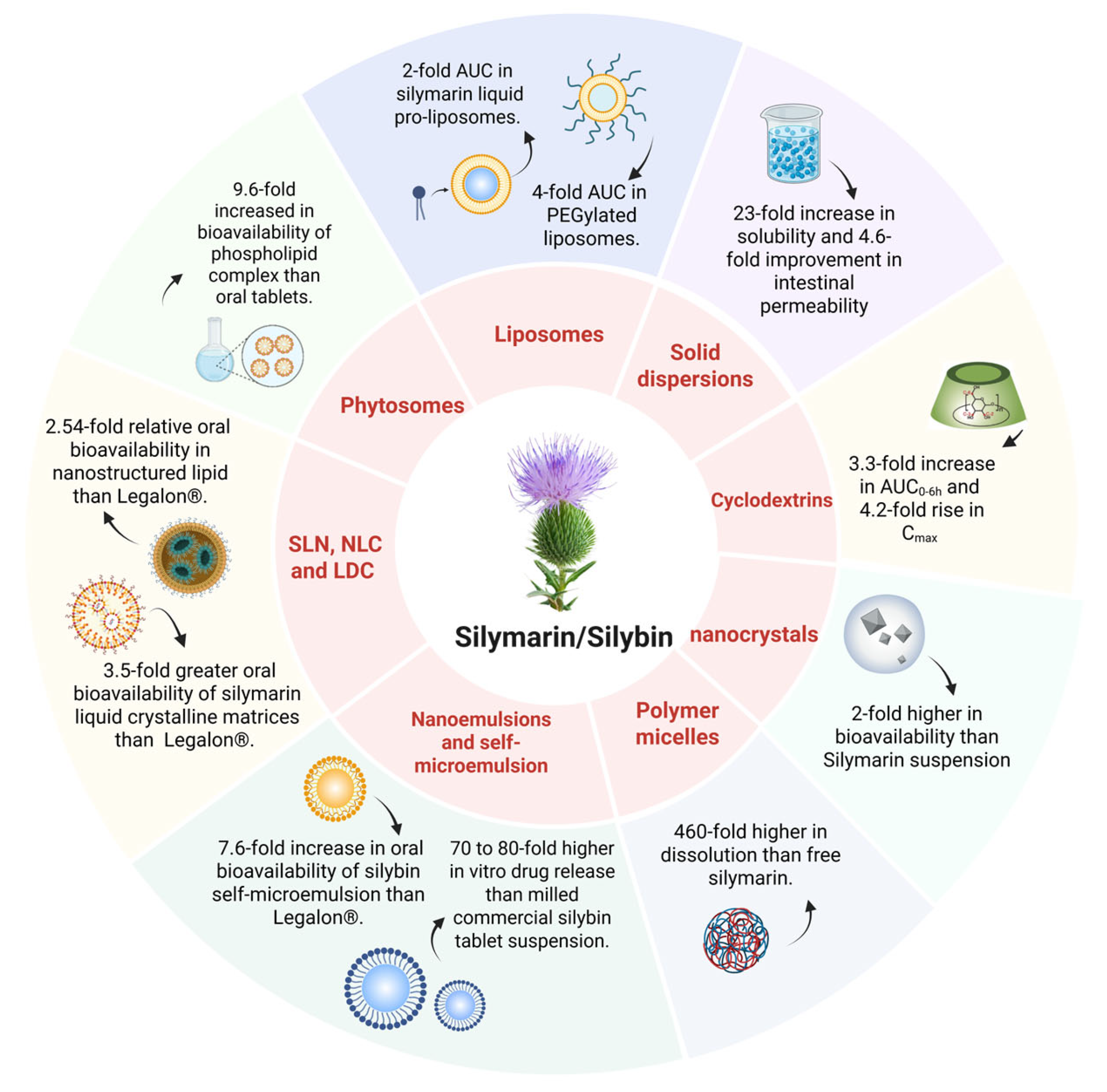 | Phytosome (phospholipid complex) | Siliphos®/Silipide®(Italy) | Lipid complex enhances permeability | Costly; variable complexation Significant; 4–10× increase vs. standard extract | [30,69,76,81] |
