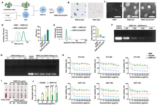 Synthesis and physicochemical property of DMPLAC. (A) Synthesis process of DMPLAC/siCD47. (B) Before and after Lactobacillus reuteri lysis (scale bar: 10 μm). (C) Electron microscope image of DMPLAC (scale bar: 100 nm). (D,E) Size and Zeta potential of DMPLAC. (F) Gel block electrophoresis of siRNA by DMPLAC. (G) Electrophoresis analysis: DMPLAC protects siRNA from RNase. (H) Toxicity of PEI25K, DMP, and DMPLAC in 293T cells. (I) Hemolysis ratio of PEI25K and DMPLAC. (J) Qualitative analysis of hemolysis. (* p < 0.05, *** p < 0.001) (Data were analyzed by t-test).