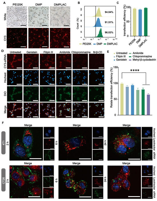 Transfection ability of DMPLAC in vitro. (A) Fluorescence transfection efficiency of CT26 cells after DMP and DMPLAC transfection (scale bar: 100 μm). (B,C) Transfection flow diagram and column diagram of DMPLAC/siRNA (n = 3). (D) DMPLAC/siRNA cell uptake mechanism map ((scale bar: 50 μm). (E) Analysis of DMPLAC/siRNA cell uptake mechanism (n = 3) (**** p < 0.0001). (F) Lysosomal uptake capacity of DMPLAC/siRNA in 4T1 cells and CT26 cells (scale bar: 50 μm). (All the above data were analyzed by one-way ANOVA).