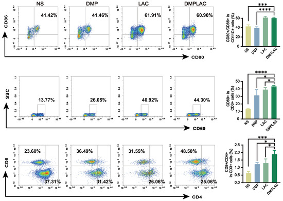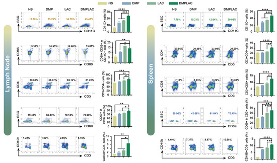 To further verify the immunostimulatory effect, we intramuscularly injected nanoparticles. The lymphocytes were then further analyzed by flow cytometry, and the gating strategies are shown in Figure S2. As shown in Figure 4, lymphocytes expressing CD11C, CD80, and CD86 in the DMPLAC group exhibited pronounced gains, demonstrating the ability of DMPLAC to induce DC maturation. The results showed that DMPLAC stimulated the activation of T cells, promoting the expression of CD4 and CD69. In addition, we evaluated changes in NK cells. The experimental data detected an increase in NK cells, suggesting that DMPLAC is an effective inducer of NK cell mobilization. Similar effects were observed in the spleen. According to the results for CD11C, DMPLAC showed the highest efficiency in stimulating the immune response, enabling proliferation of antigen-presenting cells. The increase in CD69, CD4+, and CD8+ T cells indicated the strengthening of immune function and cytotoxicity of T cells. Additionally, the NK cells of DMPLAC exhibited a greater increase.
