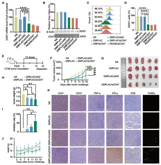 The DMPLAC/siCD47 complex knocks down the expression of CD47. (A) Level of CD47 mRNA in CT26 cells after DMPLAC/siCD47 treatment for 48 h (**** p < 0.0001) (n = 3). (Data were analyzed by one-way ANOVA). (B) Western blot analysis of CD47 protein level in CT26 cells after 48 h. (C) Flow cytometry analysis of CD47 expression. (D) Expression analysis of CD47 (**** p < 0.0001) (n = 3). (Data were analyzed by one-way ANOVA). (E) Schematic illustration of subcutaneous model design. (F) Average tumor growth curves in all treatment groups (* p < 0.05, *** p < 0.001, **** p < 0.0001) (n = 5). (Data were analyzed by two-way analysis). (G) Images of tumors were collected from each mouse in the NS group and each treatment group (n = 5). (H) Average mouse tumor weight in all treatment groups (* p < 0.05, ** p < 0.01) (n = 5). (Data were analyzed by one-way ANOVA). (I) Tumor inhibition rate in all therapeutic groups (* p < 0.05, ** p < 0.01). (Data were analyzed by one-way ANOVA). (J) Changes in body weight growth in mice in all therapeutic groups (n = 5). (Data were analyzed by two-way analysis). (K) Immunohistochemical evaluation and TUNEL analysis (scale bar: 50 μm).