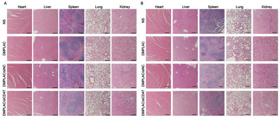 To test the efficacy of DMPLAC/siCD47, after grouping on day 3, DMPLAC, DMPLAC/siNC, or DMPLAC/siCD47 was used (10 μg siRNA per mouse or a corresponding dose of DMPLAC to 10 μg siRNA). On day 15, the animals were euthanized and the tumors and main organs were removed for further analysis. All tumors were weighed and processed for histopathological analysis.