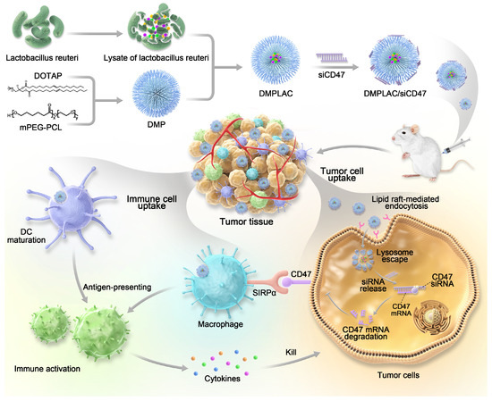 Previously, we modified the amphiphilic polymer methoxypoly(ethylene glycol)poly(ε-caprolactone) (mPEG-PCL)with cationic lipid N-[1-(2,3-dioleoyloxy) propyl]-N,N,N-trimethylammonium methyl-sulfate (cationic lipid DOTAP, Avanti). DMP (DOTAP-mPEG-PCL) was prepared by DOTAP self-assembly with mPEG-PCL [25,26]. In many nucleic acid-related gene therapy studies, DMP has been successfully applied [27,28]. In this study, we encapsulated Lactobacillus reuteri lysates into the DMP skeleton to prepare a lysate-based gene-delivery vector DMPLAC. By loading siRNA targeting CD47, we speculated that the DMPLAC/siCD47 complex could disrupt immune suppression and enhance immune response. The gene delivery and immunostimulatory abilities of the DMPLAC vector were further studied, and the anticancer ability of the DMPLAC/CD47 complex in several mouse tumor models, such as subcutaneous and abdominal tumor models, was evaluated.