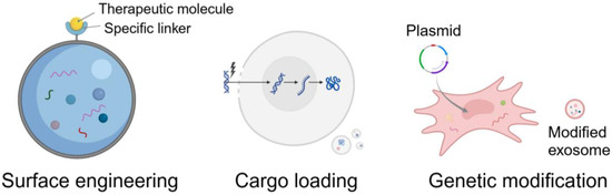 Three main strategies for modifying exosomes are surface engineering, cargo loading, and genetic modification (Figure 1), with the goal of enhancing the therapeutic potential, targeting specificity, and stability.