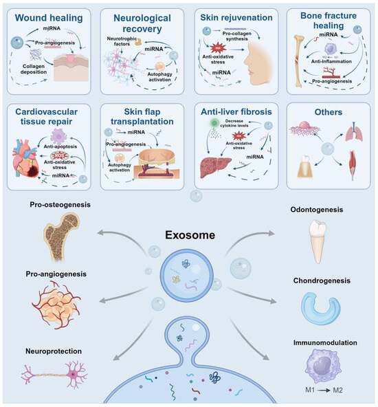 Macrophages exist in various activation states (e.g., M1 pro-inflammatory and M2 anti-inflammatory), with different contents and functions of exosomes. M1 macrophages and their exosomes are known for pro-inflammatory effects, which might adversely affect tissue regeneration [121]. Therefore, related research on M1 macrophage-derived exosomes is limited. Meanwhile, M2 macrophages are widely acknowledged to enhance inflammation regression and tissue repair. Exosomes derived from them (M2-Exos) replicate multiple functions of M2 macrophages [122], exhibiting promising immunomodulation properties. In this section, we will review the applications of M2-Exos in regenerative medicine.