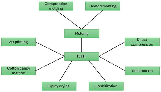 There are several technological options for the production of ODTs, as can be seen in Figure 2, of which the direct pressing process is the most simple and economical, similar to traditional tablets. The selection of excipients that ensure the appropriate porosity is crucial. The most commonly used disintegrant materials are different types of starch or starch derivatives, like sodium starch glycolate and pregelatinized starch. Microcrystalline cellulose and mannitol are also often used [10,119,120].