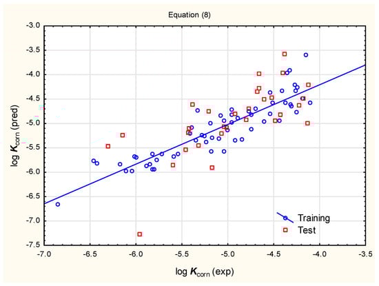 Predicted vs. observed log Kcorn for compounds 1 to 90—Equation (8).