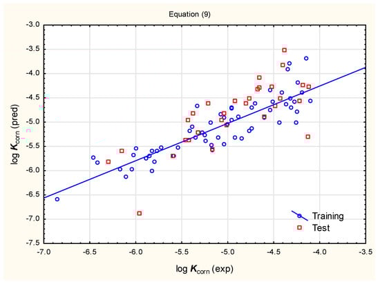 Predicted vs. observed log Kcorn for compounds 1 to 90—Equation (9).
