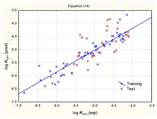 Predicted vs. observed log Kcorn for compounds 1 to 90—Equation (14).