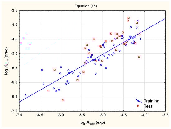 Predicted vs. observed log Kcorn for compounds 1 to 90—Equation (15).
