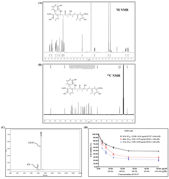 The 1H and 13C NMR spectra (A,B). HPLC chromatogram (C) of CU17 and its anti-proliferative effect against A549 cells (D). A549 cells were exposed to CU17 at varying concentrations for 24, 48, and 72 h. Data are expressed as mean ± SEM of three independent experiments conducted in triplicate.