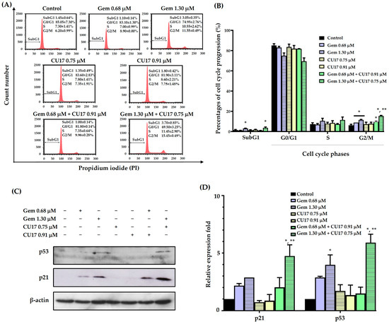 The biological effects of CU17 coupled with Gem on the regulation of the cell cycle progression and induction of apoptosis were further examined. Malignant transformation is strongly linked to cell cycle disruption and cell cycle arrest and may decrease cancer cell growth and lead to cell death; hence, the regulation of cell cycles may be linked to cancer prevention [28,29]. In this present study, we found that Gem (0.68 µM) combined with CU17 (0.91 µM) promoted greater A549 cell accumulation in the G2/M phase than each of the drugs alone. Furthermore, combining Gem (1.30 µM) and CU17 (0.75 µM) was shown to halt cell cycle progression at the S and G2/M phases (Figure 2A,B). p21 is a potent cyclin-dependent kinase inhibitor (CKI) that directly binds to cyclin-CDK2, cyclin-CDK1, and cyclin-CDK4/6 complexes to block their activities [30]. The down-regulation of p21 is linked to tumor invasion, metastasis, differentiation, and proliferation [30]. Drug-resistant phenotypes after cancer treatment are also associated with abnormal p21 protein expression [30]. Therefore, targeting p21 may be an effective treatment for malignant growth. The tumor suppressor transcription factor p53 has been reported to detect DNA damage and determine apoptosis or cell survival. Recently, p53 was shown to stimulate p21 expression, which caused cell cycle arrest [31]. In this study, the combined treatment of Gem (1.30 µM) and CU17 (0.75 µM) significantly increased the expression of p53 and p21 proteins compared to single-drug treatment (Figure 2C,D). Hence, CU17 increased the sensitivity of A549 cells to Gem by modulating p21 expression via a p53-dependent pathway.