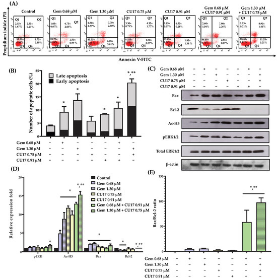The effects of single and combination drug treatments of Gem and CU17 on apoptosis induction in lung cancer A549 cells. Cells were exposed to CU17 and/or Gem for 48 h. The presence of apoptotic cells was identified using Annexin V-FITC/PI test. Dot plots depicting the representative Annexin V-FITC/PI data from three consistent trials were shown (A). Percentage of apoptotic cells after the indicated treatment was presented in bar graph (B). The protein expression levels of pERK1/2, Ac-H3, Bax, and Bcl-2 in A549 cells after various treatments were assessed using Western blot analysis. The relative optical densities of these proteins were quantified using ImageJ (C,D). The expression ratio of Bax/Bcl-2 was reported (E), where the β-actin was employed as a loading control for protein expression and total ERK1/2 was employed as a loading control for pERK1/2 protein expression. All results were expressed as mean ± SD (n = 3, * p < 0.05 compared with control and ** p < 0.05 compared with single treatment).