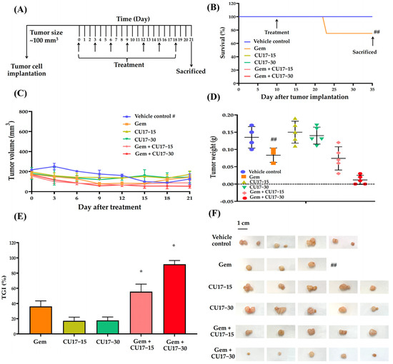 CU17 enhanced the antitumor activity of Gem in a mouse xenograft model. The experimental design included the administration of Gem (50 mg/kg) and CU17 (15 and 30 mg/kg) alone, as well as their combination (A). After 21 days of therapy, the survival rate of all xenograft mice was measured. The arrows indicate the starting point and termination of treatment (B). Representatives of tumor inhibition (C), tumor volume (D), and tumor weight (E) after treatment with the indicated drugs were demonstrated. The tumor xenografts were surgically eliminated at the end of the observing period (F). * p < 0.05, compared with vehicle control (vehicle control, n = 4; Gem, n = 3; CU17-15, CU17-30, Gem+CU17-5, and Gem+CU17-30, n = 5). # presents the tumor volumes of the vehicle control group measured at the primary site (metastasis of the vehicle-treated tumors was observed after day 12). ## displays the death of mice in the Gem group during treatment, resulting in a total of three mice remaining at the end.