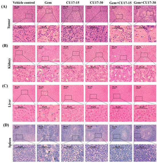 The evaluation of the systemic negative effects of pharmaceuticals on mice during treatment included monitoring changes in body weight, organ weight, and the histology of the liver, kidneys, and spleen. The starting and ending body weights exhibited no statistically significant differences between the vehicle control and all the treatment groups. The single and combination treatments did not result in any significant changes in the weights of the liver and kidneys when compared to the vehicle control group. Additionally, the spleen weights of the mice treated with CU17 alone were not decreased. In contrast, Gem alone and its combination treatments resulted in significant increases in spleen weights when compared to the vehicle control group (Table 1).