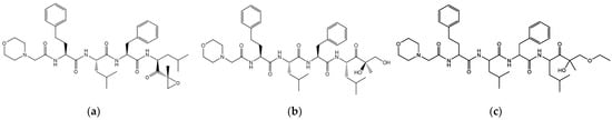 Figure 1. Structure of the examined compound and monitored degradation products: (a) carfilzomib, (b) diol, and (c) ethyl ether.
