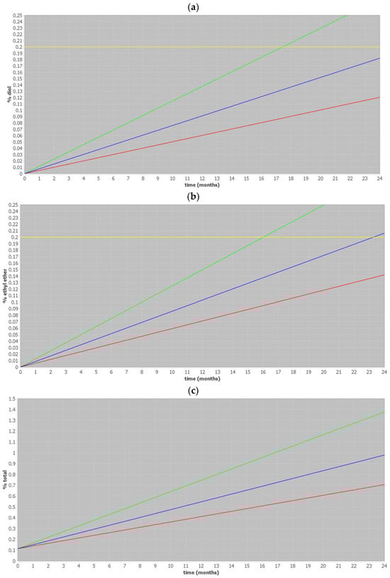 The laboratory development batch (prototype) was tested at all stability conditions described in Section 2.2. Diol impurity and ethyl ether impurity increased the most significantly during the stability studies; therefore, those two impurities were selected as critical quality attributes or as stability-indicating parameters. Additionally, total impurities were also monitored. The results for impurities of the prototype and three different formulations are presented in the Supplementary Materials (Table S1).