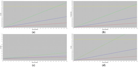A graphical presentation of the ASAP prediction is shown in Figure 2. The figures below show the predicted increase in degradation products during the shelf life of the drug product. These degradation products were determined to be critical attributes, since the levels, presented with a blue line, were close to the specified limit of 0.2%. We also show the upper 95% confidence limit as a green line which crosses the 0.2% specification limit; however, its relevance is limited in the context of drug development. This is because the ASAP evaluation process is utilized to determine the most suitable model for predicting impurities and to establish appropriate shelf-life limits for those impurities that either approach or exceed the ICH limit of 0.2% [21]. The upper 95% confidence limit becomes relevant during the registration phase of drug development, as it plays a crucial role in predicting the shelf life of the drug product based on the observed increase in impurities over time [2].