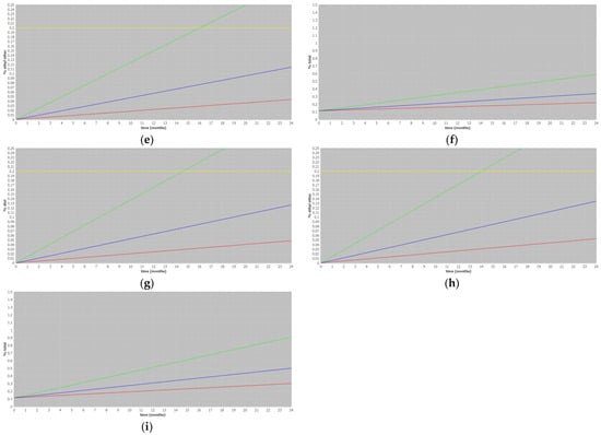 Figure 3. ASAP prediction for (a) diol impurities of formulation F1, (b) ethyl ether impurities of formulation F1, (c) total impurities of formulation F1, (d) diol impurities of formulation F2, (e) ethyl ether impurities of formulation F2, (f) total impurities of formulation F2, (g) diol impurities of formulation F3, (h) ethyl ether impurities of formulation F3, and (i) total impurities of formulation F3, where the blue line represents the average result, the green line represents the upper 95% confidence limit, the red line represents the lower 95% confidence limit, and the yellow line represents the ICH specification limit of 0.2%. An ICH limit is not presented in figures (c,f,i) since, in line with ICH guidelines, a limit for total impurities is not given.