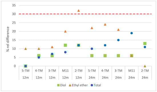 Figure 4 shows the calculated relative differences for the 12-month and 24-month time points. The exclusion of the 6-month time point from the evaluation was due to the low levels of impurities observed (below 0.05%). Consequently, those levels of impurities below the reporting threshold may contribute to higher values of the relative difference, primarily due to the variability of the analytical method. The fact that only one measurement is performed at a given time point contributes to this variability, as it can be influenced by various factors at very low levels, including random errors or occasional anomalies that can lead to values outside the expected range.