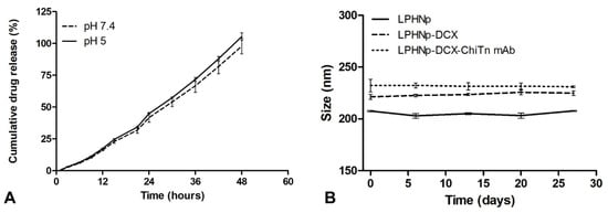 In vitro drug release of DCX from LPHNp-DCX-Chi-Tn mAb in buffer at pH 7.4 and 5 at 37 °C (A). Size distribution of LPHNp during 27 days of storage at 4 °C (B).