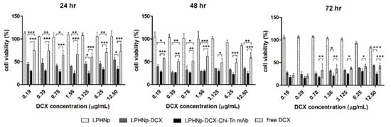 To evaluate the cytotoxicity of the obtained LPHNps and free DCX, a CCK-8 colorimetric cell viability assay was performed on the A549 human lung cancer cell line. The cells were incubated with LPHNp-DCX, LPHNp-DCX-Chi-Tn, free DCX, and blank LPHNp for 24, 48, and 72 h at concentrations ranging from 0.19 to 12.5 µg/mL. The results, depicted in Figure 5, demonstrate that LPHNps loaded with DCX significantly reduce the cell viability of the A549 cells compared to free DCX at 24 and 48 h of incubation. However, this difference becomes less pronounced at 72 h. This may be due to the accelerated uptake of the encapsulated DCX in the nanosystems and the consequent release of the drug into the cytosolic space. Moreover, the Chi-Tn antibody-functionalized LPHNps further enhances this antiproliferative response in the A549 cells, showing a significant difference compared to both LPHNp-DCX and free DCX. This suggests that the antibody enhances the internalization of the nanosystems, an observation supported by cellular uptake studies. Conversely, blank LPHNp carriers showed no impact on cell growth.