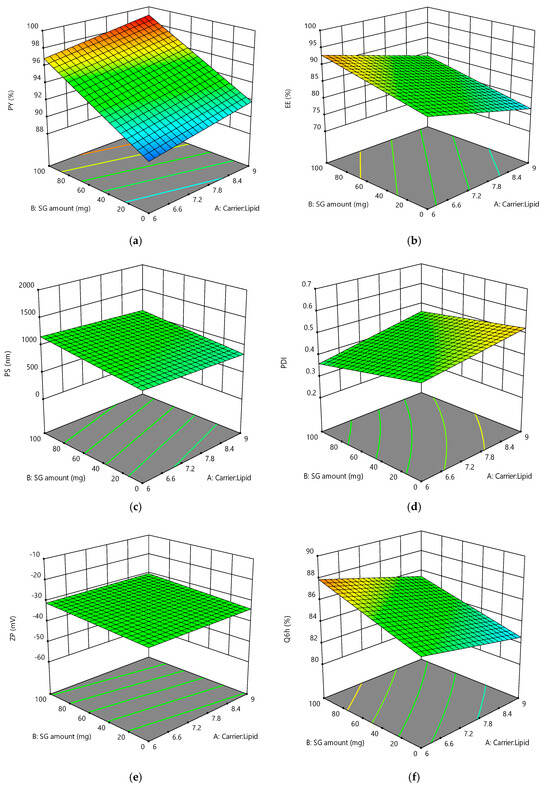 Three-dimensional response surface plots presenting the influence of the independent factors on (a) PY%, (b) EE%, (c) PS, (d) PDI, (e) ZP, and (f) Q6h.