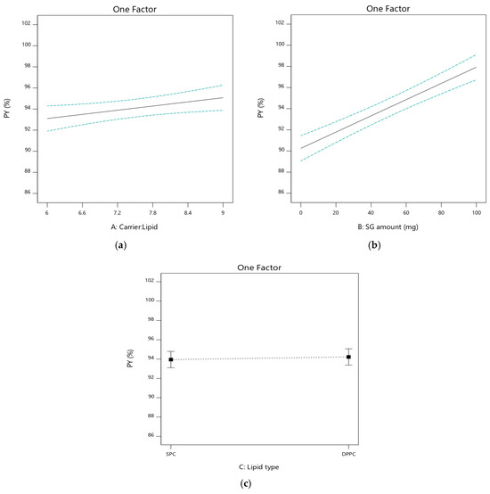 The PY% was determined after the complete drying of the prepared PLs. The PY% was in the range of 88.6 ± 2.19% to 98.8 ± 0.45%, as shown in Table 2. The impact of the independent factors on PY% is graphically illustrated in Figure 2. It was obvious that carrier/lipid phase ratio (A) had a significant impact on PY% (p < 0.05). There was a significant increase in PY% from 88.6 ± 2.19% to 92.7 ± 2.83% when the carrier/lipid phase ratio increased from 6:1 to 9:1 for PL2 and PL1, respectively. Similar results were reported by Omer et al. [28], who demonstrated that the PY% decreased when increasing the lipid content, due to the adherence of lipids to the flask wall.