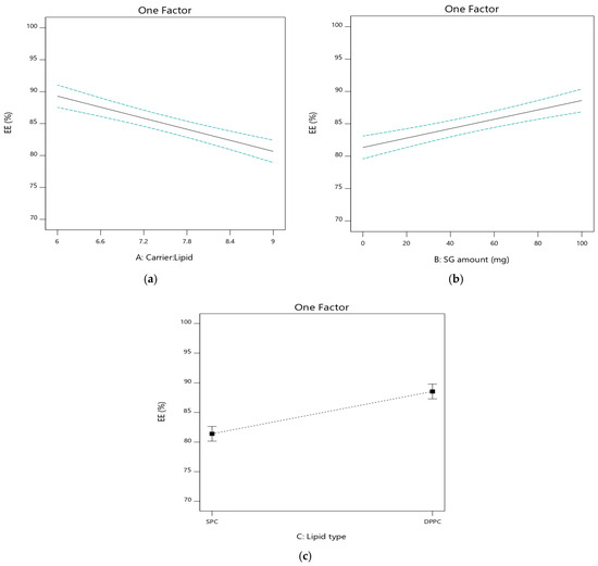 The drug was encapsulated in liposomal vesicles after aqueous hydration of the prepared PLs. The EE% of the prepared formulations ranged from 71.8 ± 2.01% to 96.1 ± 0.51%, as depicted in Table 2. The impact of the independent factors on EE% is graphically illustrated in Figure 3. It was clear that carrier/lipid phase ratio (A) had a significant influence on EE% (p < 0.05). When this ratio increased from 6:1 [PL2 (83.4 ± 0.81%), PL4 (88.9 ± 0.94%), PL6 (88.7 ± 1.40%), and PL8 (96.1 ± 0.51%)] to 9:1 [PL1 (71.8 ± 2.01%), PL3 (81.2 ± 2.17%), PL5 (81.7 ± 1.32%), and PL7 (87.9 ± 0.75%)] there was a significant reduction in the EE% of the corresponding formulations, respectively. The lipophilic characteristics of the drug might explain the increased EE% upon the increasing concentration of lipids. These results are consistent with previous reports revealing that increasing the total lipid concentration favors the formation of multilamellar vesicles (MLV), and thereby increases the trapped volume for the encapsulated drug within liposomes [45]. Similar results were reported by Omer et al. [28], who demonstrated that the EE% of salbutamol sulfate increased when increasing the lipid proportion in the formulation.