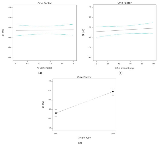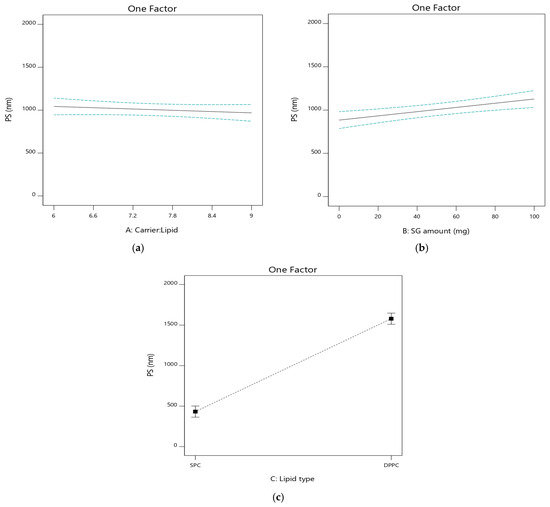 Phospholipid type (C) also had a significant effect on PS (p < 0.05). The PS of DPPC based formulations [PL3 (1358.3 ± 95.84), PL4 (1462.3 ± 28.86), PL7 (1695.3 ± 46.76), and PL8 (1801.6 ± 45.61 nm)] were higher than the corresponding SPC based ones [PL1 (330.1 ± 55.65), PL2 (385.7 ± 49.18), PL5 (490.3 ± 21.75), and PL6 (523.7 ± 25.86 nm)], respectively (Figure S2a,b in Supplementary Materials). This may be attributed to the higher hydrophobicity of longer acyl chains in DPPC and repulsive interactions between water molecules at the interface, resulting in aggregation of vesicles [47].