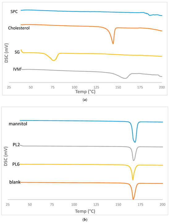 Differential scanning calorimetric analysis was conducted to investigate the solid-state properties of the selected formulations. The DSC thermograms of pure IVM, SG, SPC, cholesterol, mannitol, the selected formulations (PL2 and PL6), and the blank formulation were carried out using a DSC instrument (DSC 60, Shimadzu Co., Kyoto, Japan). About 2 mg of each sample was placed in an aluminum pan and sealed. Each sample was heated to 200 °C at a ramping speed of 10 °C/min under a nitrogen purge (20 mL/min).
