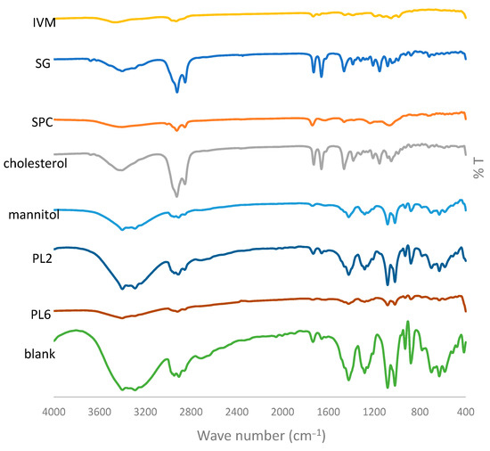 In order to determine drug–excipient compatibility, comparisons were made between the FTIR spectra of pure IVM, SG, SPC, cholesterol, mannitol, the selected formulations (PL2 and PL6), and the blank formulation by using a Perkin-Elmer FTIR spectrophotometer (series 1600, Perkin-Elmer Corporation, Waltham, MA, USA) under vacuum from 4000 to 400 cm−1 with a resolution of 4 cm−1 through the potassium bromide disk method.