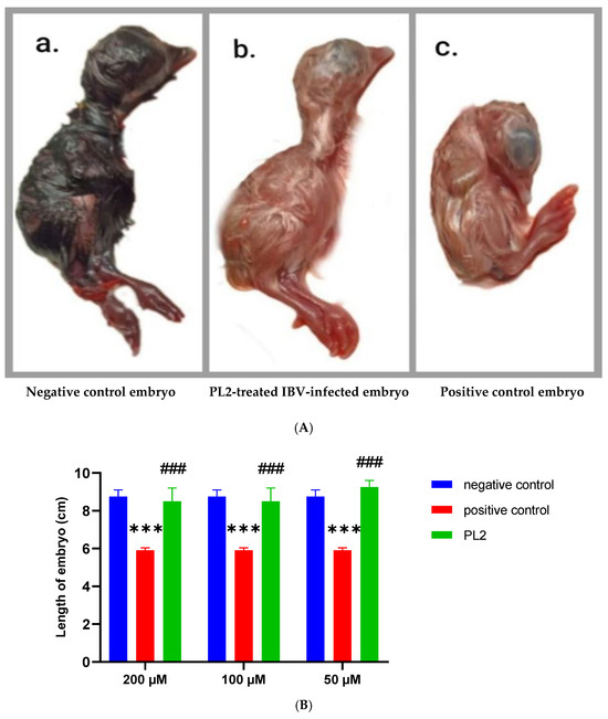 Macroscopic visualization of the embryos showed an absence of curling and dwarfing in IBV-infected ECEs treated with PL2, as presented in Figure 12A; there was a statistical significant difference (p < 0.001) in the lengths of ECEs in the positive control group compared to those of the negative control group. On the other hand, it was observed that the lengths of IBV-infected ECEs treated with PL2 at all studied doses were not significantly differed from those of the negative group, but there was a statistically significant difference (p < 0.001) in comparison with those of the positive control group: Figure 12B.