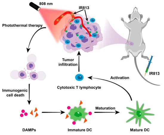 In the ongoing effort to overcome key challenges in cancer therapy, such as tumor recurrence [1], metastasis [2], and side effects [3], the scientific community [4] continues to explore innovative therapeutic strategies to enhance efficacy and minimize adverse reactions. Photothermal therapy, a promising new treatment method, uses near-infrared (NIR) light converted into heat by photothermal agents to selectively kill tumor cells [5,6,7]. Photothermal therapy offers targeted treatment with potentially lower systemic toxicity [8,9]. In recent years, there has been a notable emergence of molecules with near-infrared absorption and photothermal effects, which have become widely utilized in the activation of immunity for the purpose of photoimmunotherapy in the treatment of tumors [10,11,12]. As a high-end NIR fluorescence probe, IR813 has clearly demonstrated its key role in biomedical imaging, primarily because of its deep tissue penetration and minimal background interference. IR813, when doped into silica nanoparticles, has the properties of high brightness, photostability, and non-toxicity. These enable efficient hepatobiliary excretion and accurate lymph node mapping. Similarly, the use of IR813 in the synthesis of red-emitting carbon dots results in far-red emission and has potential for solvent polarity sensing and applications in in vivo imaging and drug delivery [13,14,15]. As a kind of cyanine derivatives, IR813 has demonstrated its potential as a highly efficient infrared absorber, capable of converting absorbed light energy into thermal energy [16]. This unique photothermal conversion property not only strengthens its position in high-resolution biomedical imaging but also opens new avenues for a wide range of photothermal therapy applications. It can reach the tumor through blood circulation and trigger cell death upon NIR exposure. Beyond its direct effects, the immunogenic cell death induced by IR813 with NIR light is of particular interest [17,18,19,20]. This process may activate the immune system to detect and destroy lingering cancer cells.