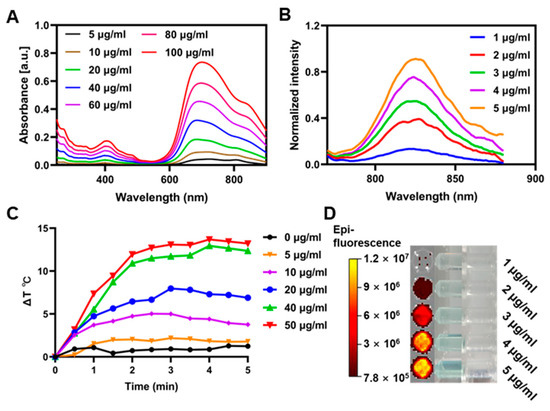 Characterization of IR813. (A) UV-vis-NIR spectra of IR813 at various concentrations. (B) Fluorescence spectra of IR813 at different concentrations. Excitation wavelength = 765 nm. (C) Photothermal conversion curves for different concentrations (0–50 µg/mL) of IR813 with 808 nm photoirradiation at 1 W/cm2. (D) Fluorescence image and optical images of IR813 solution at different concentrations (excitation: 710 nm; emission: 820 nm).