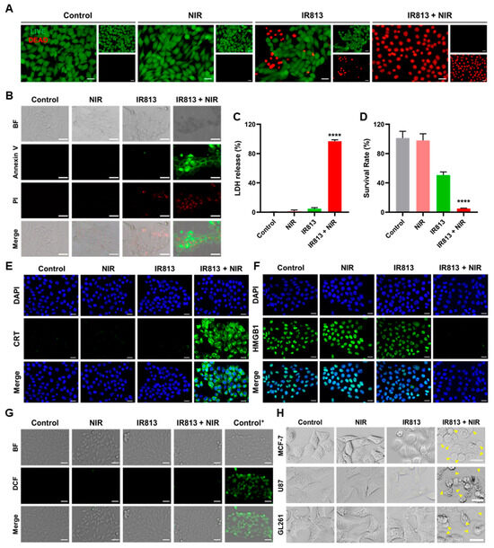 After seeding U87, MCF-7, and GL261 cells (1 × 105 cells per milliliter) in 96-well plates (0.1 mL) overnight, the cells were exposed to IR813 + NIR (5 μg/mL, 808 nm, 5 min, 1 W/cm2), and the morphology of the cells was obtained using brightfield illumination and an inverted fluorescence microscope. Through the Cell Counting Kit-8 and the Cytotoxic LDH Assay Kit-WST, the viability of the cells was assessed after a 3 h incubation period.
