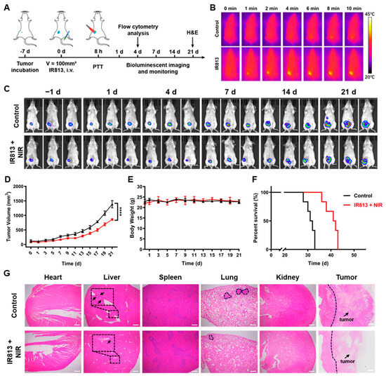 Female Balb/c mice (6–8 weeks) were given subcutaneous injections of 100 µL of 4T1 cells (1 × 106 cells per mouse) in the breast fat pad to generate an animal model of an orthotopic tumor. At approximately 100 mm3, the tumor volume was measured in the mice, and they were randomized to undergo treatment with IR813 + NIR (1 mg/kg) or the control (n = 12). After administration in the tail vein, the mice in the IR813 + NIR group were monitored by a small animal in vivo imaging system (Caliper) at a designed point (excitation: 710 nm; emission: 820 nm). As for the IR813 + NIR group, the tumor was radiated with an 808 nm laser for 10 min (1 W/cm2) after receiving an intravenous injection of IR813 for 2 h and the thermal imaging results were acquired with FLIR (emissivity: 0.95; reflected temperature: 25 °C; humidity: 50%; distance: 20 cm; thermal sensitivity: ≤0.001 °C; frame rate: 1 Hz). Every 2 days, measurements were taken of the mice’s body tumor size and weight. The formula V = W2L/2 was used to determine the tumor size, where W and L represent the smallest and longest diameters, respectively. To assess immune activation, three mice were randomly selected and the tumors, spleen, and lymph nodes were collected four days after treatment. Cut into small pieces, the collected tumors were dipped into Tumor Tissue Digestion Solution to form a single-cell suspension solution. To obtain a suspension of tumor cells, this solution was squeezed gently through a 70 μm nylon membrane after being incubated for 45 min at 37 °C. To produce single-cell suspensions, the removed spleen and lymph nodes were also passed through a 70 μm nylon membrane. The individual cells were stained using fluorescently tagged antibodies, following the manufacturer’s instructions. Anti-CD3, anti-CD4, and anti-Foxp3 antibodies were used to stain lymphocytes in order to analyze regulatory T cells (Tregs; CD3+CD4+Foxp3+), following the manufacturer’s instructions. CD3+(CD8+/CD4+) cells were stained with anti-CD3, anti-CD4, and anti-CD8 antibodies in order to analyze immunological activity. To assess cytotoxic T cells (CD3+CD8+Granzyme B+), anti-CD3, anti-CD8, and anti-granzyme B antibodies were used to stain the lymphocytes. On day twenty-one, three mice were randomly selected and sacrificed, and their organs were taken for histological analysis. This analysis made use of hematoxylin and eosin staining.