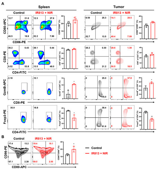 Immune activation effects. (A) Typical flow cytometric results and quantification of matured DCs (CD80+CD86+ DCs) belonging to CD11c+ cells, CD8+ T cells, cytotoxic T lymphocytes, (CD8+Granzyme B+) and regulatory T cells (CD4+Foxp3+) belonging to CD3+ cells in spleens and primary tumors. (B) Typical flow cytometric results and quantification of matured DCs (CD80+CD86+ DC cells) belonging to CD11c+ cells in inguinal lymph nodes. Mean ± SD (n = 3) is employed to present data in all instances. * p < 0.05 and ** p < 0.01.