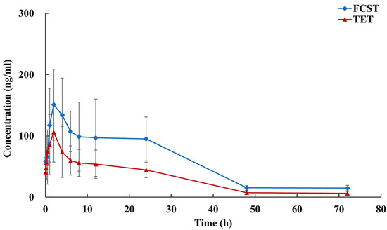 According to the analysis in Figure 2 and Table 1, the area under the drug–time curve (AUC) of the FCST group was significantly larger than that of the TET group, being 1.93 times higher. The peak drug concentration (Cmax) of the FCST group was larger than that of the TET. In addition, the time to peak (Tmax) of the FCST group was significantly longer than that of the TET. The clearance (CL) of the FCST group was significantly lower than that of the TET. The results of this experiment suggested that the pharmacokinetic parameters of FCST changed compared with TET significantly.