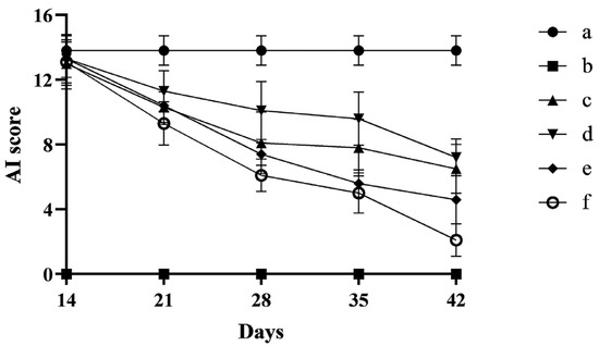 Figure 3. Variation in AI scores during treatment in rats (a. blank group, b. model group, c. TET group, d. FCST group (1.35 mg/kg), e. FCST group (2.70 mg/kg), f. FCST group (5.40 mg/kg)) (mean ± SD, n = 8).