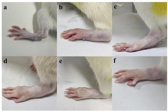 Figure 5. Appearance of the rat’s toes at the end of treatment (a. blank group, b. model group, c. TET group, d. FCST group (1.35 mg/kg), e. FCST group (2.70 mg/kg), f. FCST group (5.40 mg/kg)). Note: comparison with blank group, ** p < 0.01; compared with model group, Δ p < 0.05, ΔΔ p < 0.01; compared with TET, # p < 0.05.