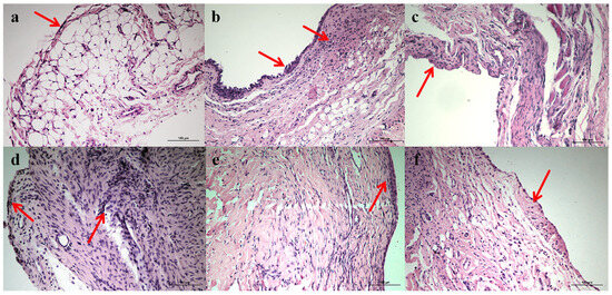 Figure 6. Effects of FCST on ankle joint histopathology of RA rats ((a) blank group, (b) model group, (c) TET group (d) FCST group (1.35 mg/kg), (e) FCST group (2.70 mg/kg), (f) FCST group (5.40 mg/kg)), (×400), arrows represent synovial thickening in each group.