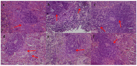 Figure 7. Effects of FCST on spleen histopathology of RA rats ((a) blank group, (b) model group, (c) TET group (d) FCST group (1.35 mg/kg), (e) FCST group (2.70 mg/kg), (f) FCST group (5.40 mg/kg)), (×400), arrows represent the pathological changes of the spleen in each group.