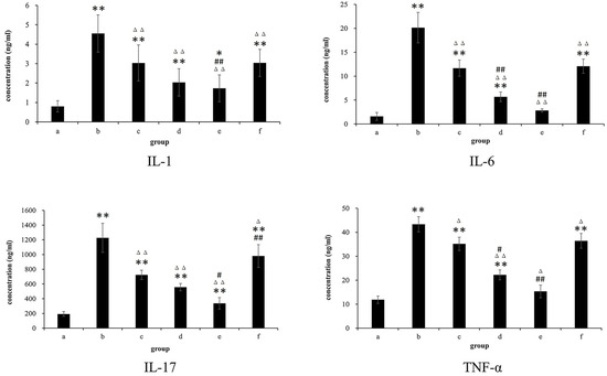Figure 8. The expression on serum levels of IL-1, IL-6, IL-17, and TNF-α in rats with arthritis (mean ± SD, n = 8) (a. blank group, b. model group, c. TET group, d. FCST group (1.35 mg/kg), e. FCST group (2.70 mg/kg), f. FCST group (5.40 mg/kg)). Note: comparison with blank group, * p < 0.05, ** p < 0.01; compared with model group, Δ p < 0.05, ΔΔ p < 0.01; compared with TET, # p < 0.05, ## p < 0.01.