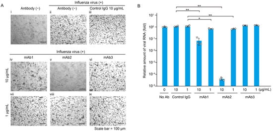 The three monoclonal antibodies at 1 µg/mL and 10 µg/mL concentrations and FluV (2 × 104 pfu/mL) were incubated at room temperature for 1 h, and 100 µL of the mixture was added to MDCK cells in a 96-well plate. The cells were incubated at 37 °C for 48 h, and cell morphology was observed under an optical microscope CKX31 (Olympus, Tokyo, Japan). The amount of viral RNA in the culture supernatant at 48 h post-infection (hpi) was determined using RT-qPCR (reverse transcription quantitative PCR).