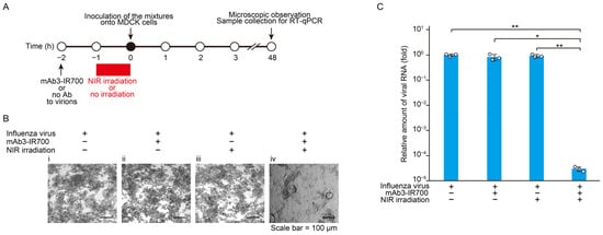 Direct inactivation of FluV particles by NIR-AVPIT. (A) Schematic diagram of the experiment used to evaluate the direct effect of NIR-AVPIT on FluV virions. (B) Representative images of CPE in MDCK cells 48 h after FluV inoculation. Scale bar = 100 µm. (i) no antibody/no irradiation, (ii) mAb3-IR700/no irradiation, (iii) no antibody/NIR irradiation, (iv) mAb3-IR700/NIR irradiation. (C) The amounts of viral RNA amplified in the culture of MDCK cells during 48 h incubation. The relative viral RNA quantities were measured by RT-qPCR. The experiments were repeated independently at least three times with good reproducibility. The data are shown as the mean ± SD. Asterisks indicate statistically significant differences when compared with the control cells. * p < 0.05, ** p < 0.01.