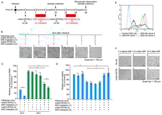 Effect of NIR-AVPIT on virus infected cells and HA-expressing cells. (A) Schematic diagram of the experiments to evaluate the effect of single or double NIR-AVPIT on FluV-infected cells. (B) Microscopic observation of MDCK cells with or without NIR-AVPIT 48 h after virus inoculation. FluV-infected cells were treated with single (at 7 or 25 hpi) or double (at 7 and 25 hpi) NIR-AVPIT. (i) no antibody/no irradiation, (ii) mAb3-IR700 (24 hpi)/no irradiation, (iii) no antibody/NIR irradiation (25 hpi), (iv) mAb3-IR700 (24 hpi)/NIR irradiation (25 hpi), (v) mAb3-IR700 (6 hpi)/NIR irradiation (7 hpi), (vi) mAb3-IR700 (6 and 24 hpi)/NIR irradiation (7 and 25 hpi). (C) The amounts of viral RNA produced from the infected MDCK cells with or without NIR-AVPIT at 24 or 48 hpi. The relative viral RNA quantities were measured by RT-qPCR. These data were obtained from three independent experiments and are presented as the mean ± SD. Asterisks indicate statistically significant differences with p < 0.05. (D) The viability of FluV-infected cells with or without NIR-AVPIT treatment. At 48 hpi, the viability of MDCK cells was evaluated by MTS assay. Results are shown as the mean ± SD from three independent experiments. Asterisks indicate statistically significant differences with * p < 0.05. (E) Selection of HA-expressing HEK293 clones by FACS analysis. Blue, control 293 cells (no HA expression); black, 293-HA clone 1; green, 293-HA clone 2; and magenta, 293-HA clone 3. The expression level of HA is the highest in 293-HA clone 3. (F) Representative micrographs of 293-HA clone 3 cells with or without NIR-AVPIT. Cell morphology was observed 1 h before NIR treatment and 1.5 h and 24 h after NIR treatment. (i) no antibody/1 h before NIR, (ii) no antibody/1.5 h after NIR, (iii) no antibody/24 h after NIR, (iv) mAb3-IR700/1 h before NIR, (v) mAb3-IR700/1.5 h after NIR, (vi) mAb3-IR700/24 h after NIR.
