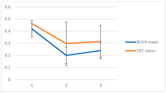 The mean central retinal thickness, CRT, was 463 ± 180 µm at baseline. CRT showed significant improvement (p < 0.05) at one month after slow-release dexamethasone treatment, with a mean value of 297 ± 130 µm. Similarly to BCVA, at three months after treatment, the improvement was maintained, with a mean value of 315 ± 120 µm. The data for BCVA and CRT are summarized in the Figure 1.