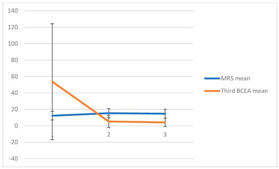 Statistical analysis was performed using Prism version 9.5.0 (GraphPad Software Inc., San Diego, CA, USA). Data were expressed as mean standard deviation (SD). The Anderson–Darling and Kolmogorov–Smirnov tests were applied to assess whether data were normally distributed. Data analysis used the Wilcoxon signed-rank test and Student’s t-test on an Excel spreadsheet. A p value of less than 0.05 was considered statistically significant. Each variable was independently evaluated without being correlated with others. However, for the interpretation of this study, it should be taken into account that the results demonstrated considerable variability, particularly for BCEA and MRS, while CRT demonstrated more moderate variability.
